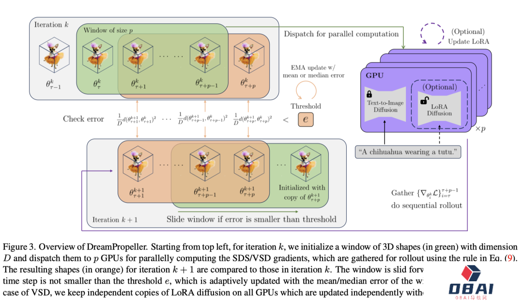 在每次迭代(k次)的开始,初始化一个由3D形状(用绿色表示)组成的窗口,然后,这些形状被分发到p个GPU上进行并行计算,在GPU上并行计算形状的SDS/VSD梯度。