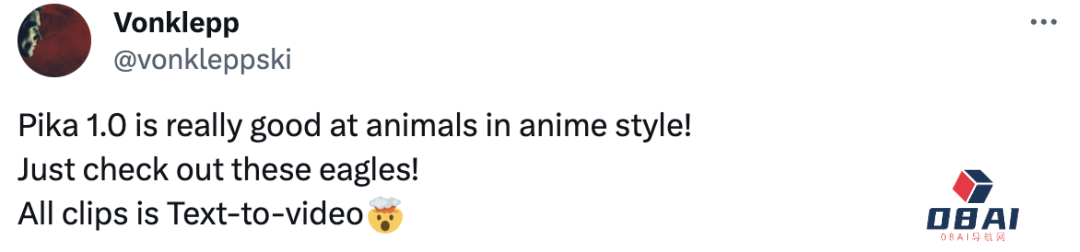 Pika 1.0非常擅长动漫风格的动物,看看这些不同场景中的老鹰就知道了。