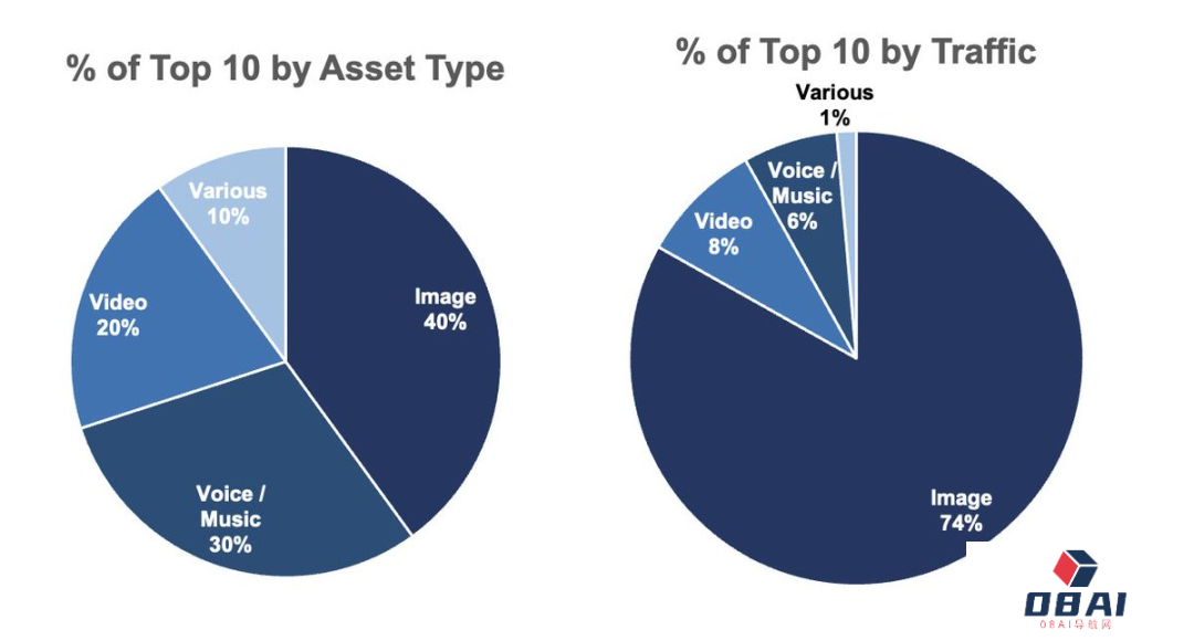 按流量计算,图片占了前10名流量的74%,其次是视频8%,语音/音乐6%。