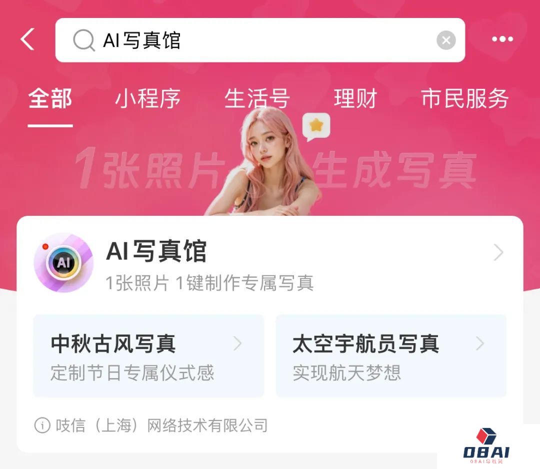 支付宝APP内搜索?:AI**馆,即可进入该小程序应用。可以看到这款小程序的开发商是上海吱信,属于蚂蚁集团旗下子公司。