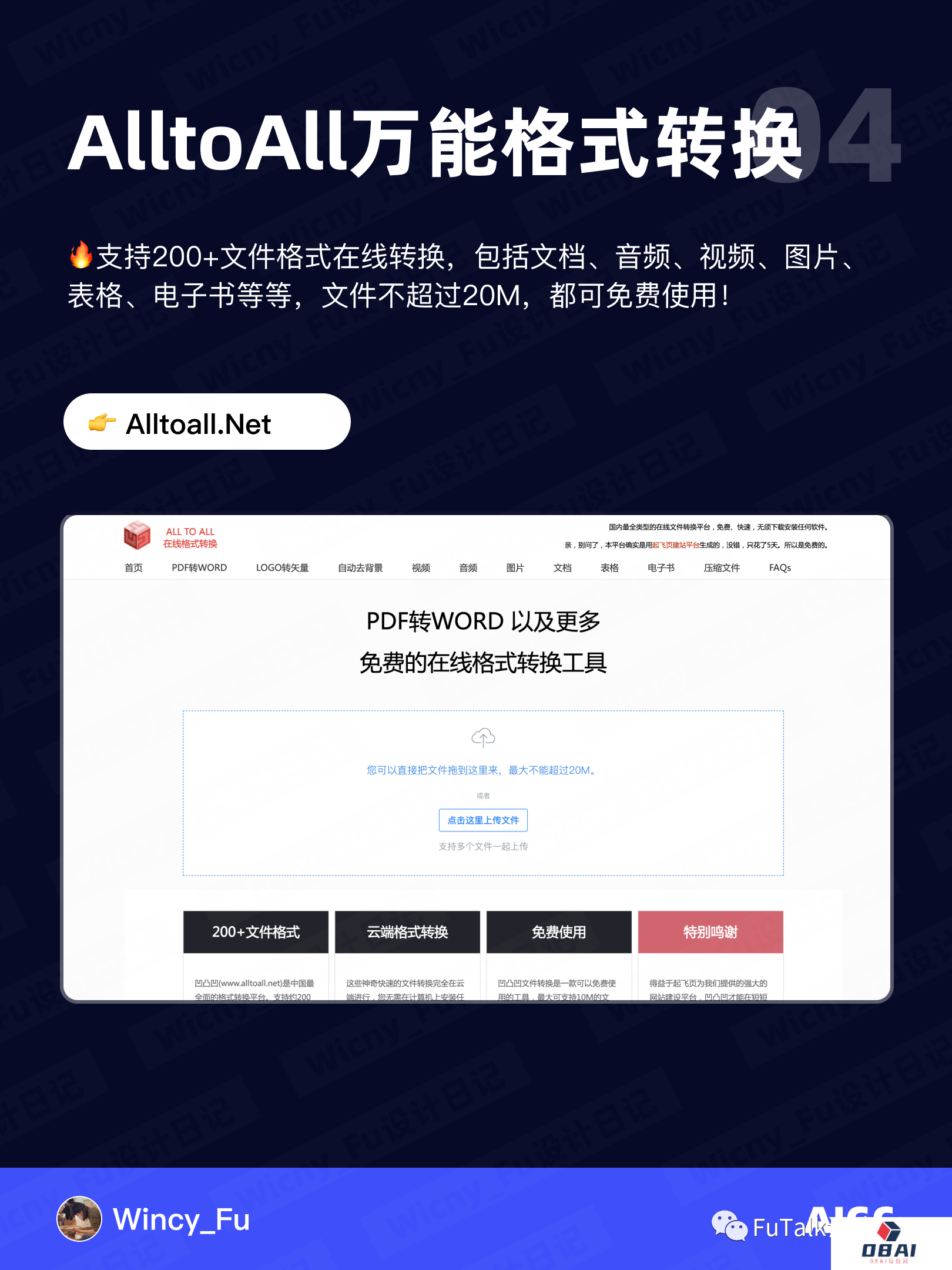 4、AlltoAll万能格式转换:支持200+文件格式在线转换,包括文档、音频、视频、图片、表格、电子书等等,文件不超过20M,都可免费使用!