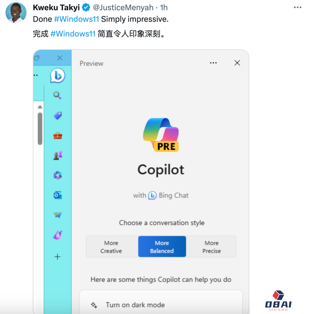 没错,就是那个New Bing上的Copilot,现在被微软加进整个操作系统中,取代了语音助手Cortana的位置,但比Cortana强大不少。