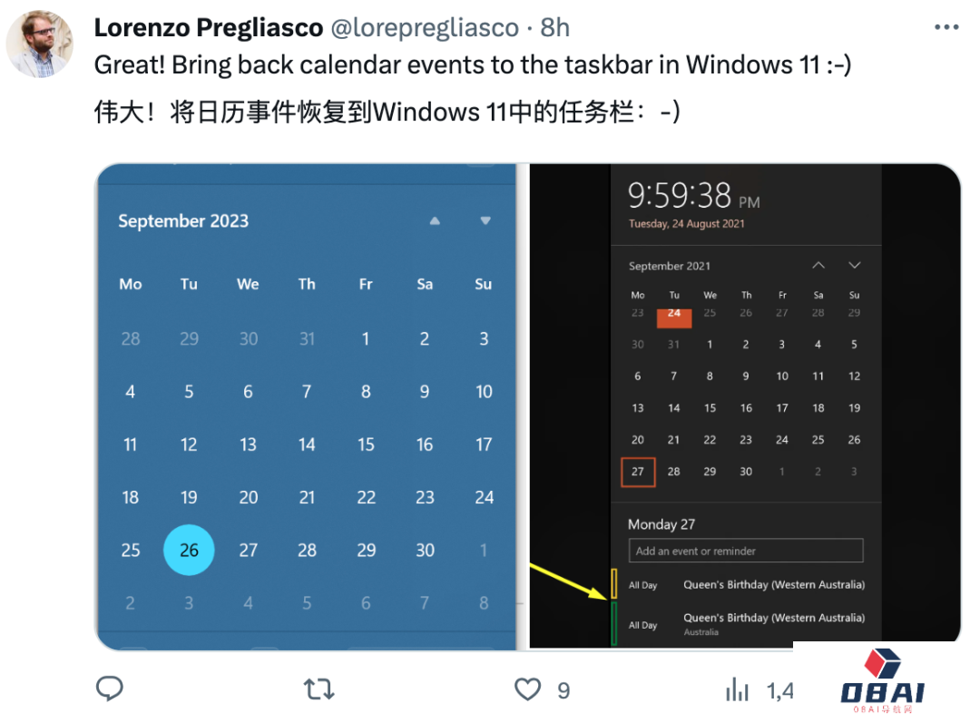 还有网友很喜欢的一个功能是,更新后的Windows 11.将日历事件恢复到了任务栏中: