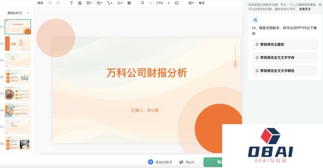 以“万科公司财报分析”为例,我只需要输入指令,选择PPT模板,就能得到一份包含公司概述、财务指标分析、竞争力分析、风险因素分析等内容的PPT。