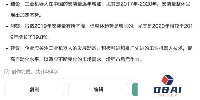 我选择了一组2016年-2020年我国工业机器人安装量的统计数据,百度文库很快生成了图表以及基于数据的结论、洞察、建议。