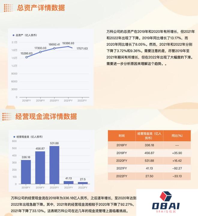 比如比较万科公司2019到2022年总资产时,我发现其采用了折线图,能够看到这几年间这一金额的整体变化趋势。而为了体现万科公司在2018-2022年间,其中一项数据在2021、2022年出现了明显的变化,百度文库通过柱状图将这种变化凸显了出来,并且在下方的图表分析内容中也进行了重点解释。