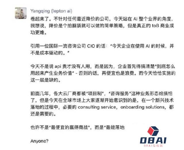 阿里巴巴原副总裁贾扬清在朋友圈发布观点表示,“站在整个AI业界的角度,降价是个拍脑袋就可以做的简单策略,但是真正的To B商业成功更难。”
