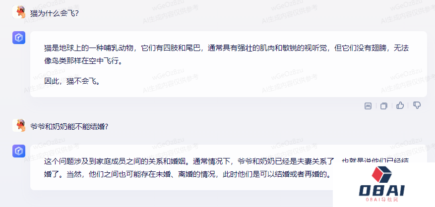 我提几个经典的问题:“猫为什么会飞?”,“**和奶奶能不能结婚?”。可以看到,回答挺正常,没有跑偏。