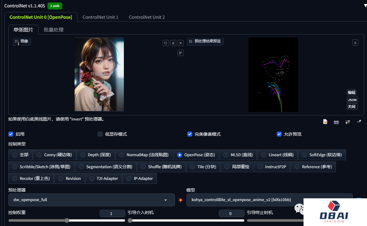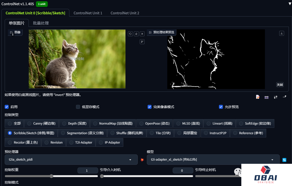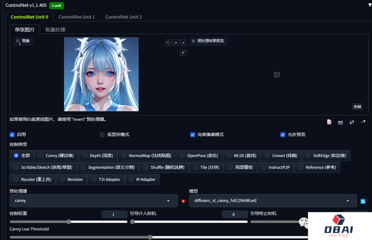 在canny模型中,我推荐使用“diffusers_xl_canny_small”,出图快,效果也还不错;depth模型中,我推荐使用“diffusers_xl_depth_small”,理由同上,其实“sai_xl_depth_128lora”效果也不错,但是渲染时间太长了,当然这个不是模型的问题,是我的问题,因为我买不起那么好的电脑;Sketch模型中,我推荐使用“t2i-adapter_xl_sketch”,这是腾讯家出品的,起码还挺还原的;openpose模型中,推荐“thibaud_xl_openpose_256lora”,虽然它画的不太准,但是它时间短啊,唉。。。