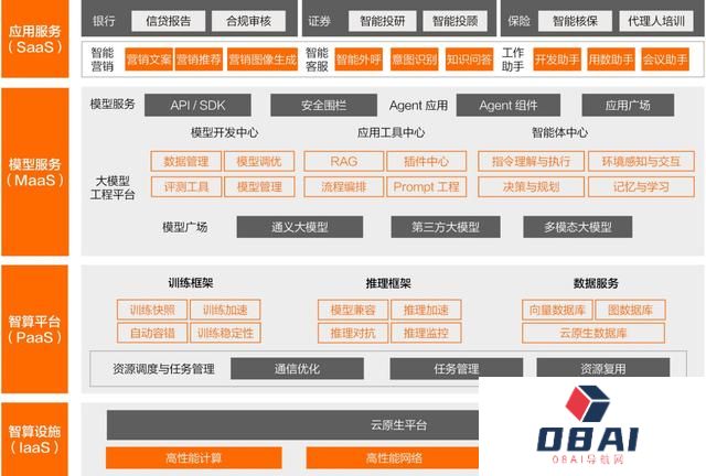 应用服务(SaaS):在应用层上,考虑到金融领域的多方位需求,将应用划分为两大类别以实现广泛适用性与行业特异性。一类是通用应用场景,跨越整个金融行业,涵盖诸如智能客服来提升服务体验、智能营销以增强市场触达,以及工作助手以提高日常办公效率。另一类则专注于金融细分市场的独特需求,例如银行业专注于信贷报告自动化生成与严谨的合规性审查;证券业则侧重投资研究与顾问服务的智能化;而在保险业,致力于通过“保险数字生产力”提升业务效能,具体体现为智能核保流程的优化以及代理人培训系统的智能化。