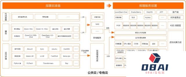分层设计:由于模型本身文件较大,模型加载和启动时间往往以分钟甚至小时计。在模型准备阶段,将运行依赖环境、模型文件、推理代码分层设计统一验证并推送到合适的存储服务层;在模型部署阶段,通过云平台存算分离,共享挂载、缓存加速等方式实现模型的快速部署和加速启动;
