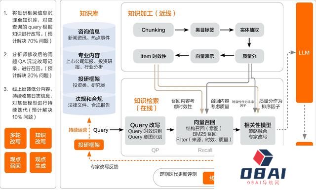 1、构建知识库:基于咨询信息、专业内容、投教百科研报、投研框架、指标信息等,构建基础投研知识库。并将以往历史问答、专家经验以投研框架的方式进行回流,实现持续性的知识生产和知识库运营。