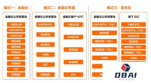 三、线下IDC与金融云混合方式。对于私有数据不能出域的客户,可以采用线下数据中心(IDC)与金融云混合的方式。企业在其内部的IDC中构建智能计算集群,部署大模型及应用开发平台。应用的开发全程在IDC内完成,并在IDC环境中部署运行。在面对业务高峰或IDC资源紧张的情况下,企业可以采取灵活策略,将大模型扩展到金融云的资源池中,实现流量的智能分配,将部分业务负载转移到金融云上进行高效的模型推理,以应对高并发需求。同时,根据实际需要,可以选择性地将微调数据迁移至金融云,利用其强大算力进行模型的微调,进一步优化性能和服务能力。