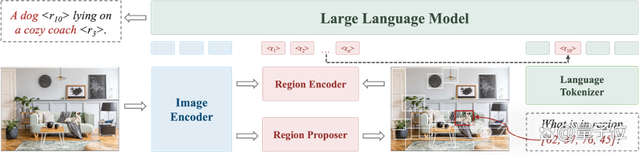 同时,这样的设计也充分利用了vision tokenizer本身的空间理解能力,而无需外接专家模型(比如SAM)来辅助定位,从而避免了外接模型的冗余。具体而言,Groma在全局图像编码的基础上,引入了区域编码来实现定位功能——如下图所示,Groma先利用Region Proposer定位潜在的物体,再通过Region Encoder将定位到的区域逐一编码成region token。而大语言模型则可以根据region token的语意判断其对应的区域,并通过在输出中插入region token来达成类似超链接的效果,实现visually grounded conversation。同样地,用户指定的区域也可以通过Region Encoder编码成相应的region token,并插入到用户指令中,从而让多模态模型能关注到指定的区域并产生指向性的回答。
