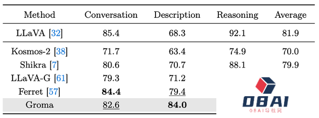 同时,Groma在多模态大模型通用的VQA Benchmark (LLaVA-COCO)验证了其对话和推理能力。