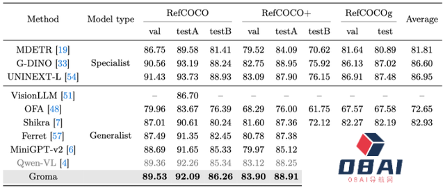 为了提升定位的鲁棒性和准确性,Groma采用了超过8M的数据(包括SA1B)来预训练Region Proposer。因此其产生的proposal不仅包括常见的物体,也涵盖了物体的组成部分以及更广阔的背景等要素。此外,得益于分离式的设计,Groma可以采用高分辨率特征图用于Region Proposer/Encoder的输入,并采用低分辨率的特征图用于大模型输入,从而在降低计算量的同时又不损失定位性能。实验结果Groma在传统的Grounding Benchmarks上表现出了超越MiniGPT-v2和Qwen-VL的性能。