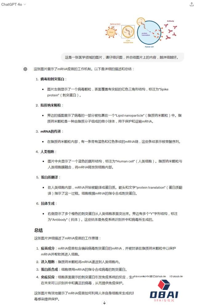 GPT-4o的表现惊艳,不仅准确识别了该图的主旨内容,并依据图示上的过程用通俗的语言解释了mRNA疫苗的工作原理。