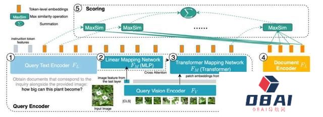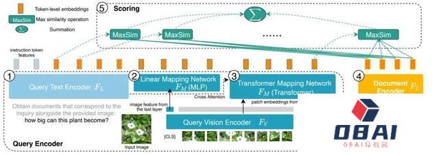 图 6:PreFLMR 的模型结构。问询(Query)被编码为 Token-level 的特征。PreFLMR 对问询矩阵中的每一个向量,找到文档矩阵中的最近向量并计算点积,然后对这些最大点积求和得到最后的相关度。