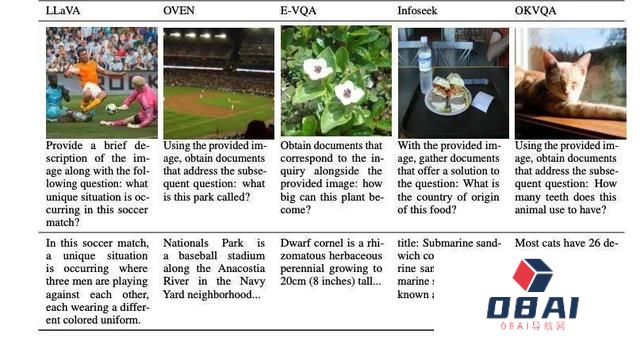 为了大规模预训练和评估通用多模态检索模型,作者汇编了十个公开的数据集并将其转换为统一的问题 – 文档检索格式。这些数据集的原本任务包括图像描述(image captioning),多模态对话(multi-modal dialogue)等等。下图展示了其中五个任务的问题(第一行)和对应文档(第二行)。