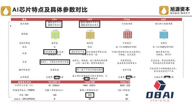 AI芯片分为几类。首先是CPU,其逻辑单元占60%,计算单元占40%。CPU在复杂的逻辑运算能力方面较强,主要用于逻辑控制,但计算单元较少,不擅长处理并行计算任务。