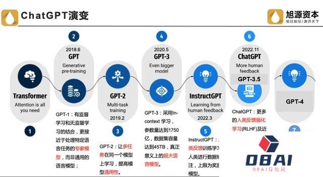 ChatGPT未来的产业化主要涵盖归纳、代码生成、图像处理、智能客服等领域。最初是基于Transformer模型的GPT,于2018年6月首次出现。接着,发展出GPT-2,这是一个多任务的通用模型。到了2020年,GPT-3是一个超大规模的语言模型,标志着一个里程碑。在2022年3月,人类反馈强化学习的引入进一步提升了AIGC的能力,因为通过人类反馈,它可以不断地进行训练和迭代,不断螺旋式地上升。到了2022年11月,强化学习进一步优化了AIGC的性能,持续出现了更多思维逻辑的推理。