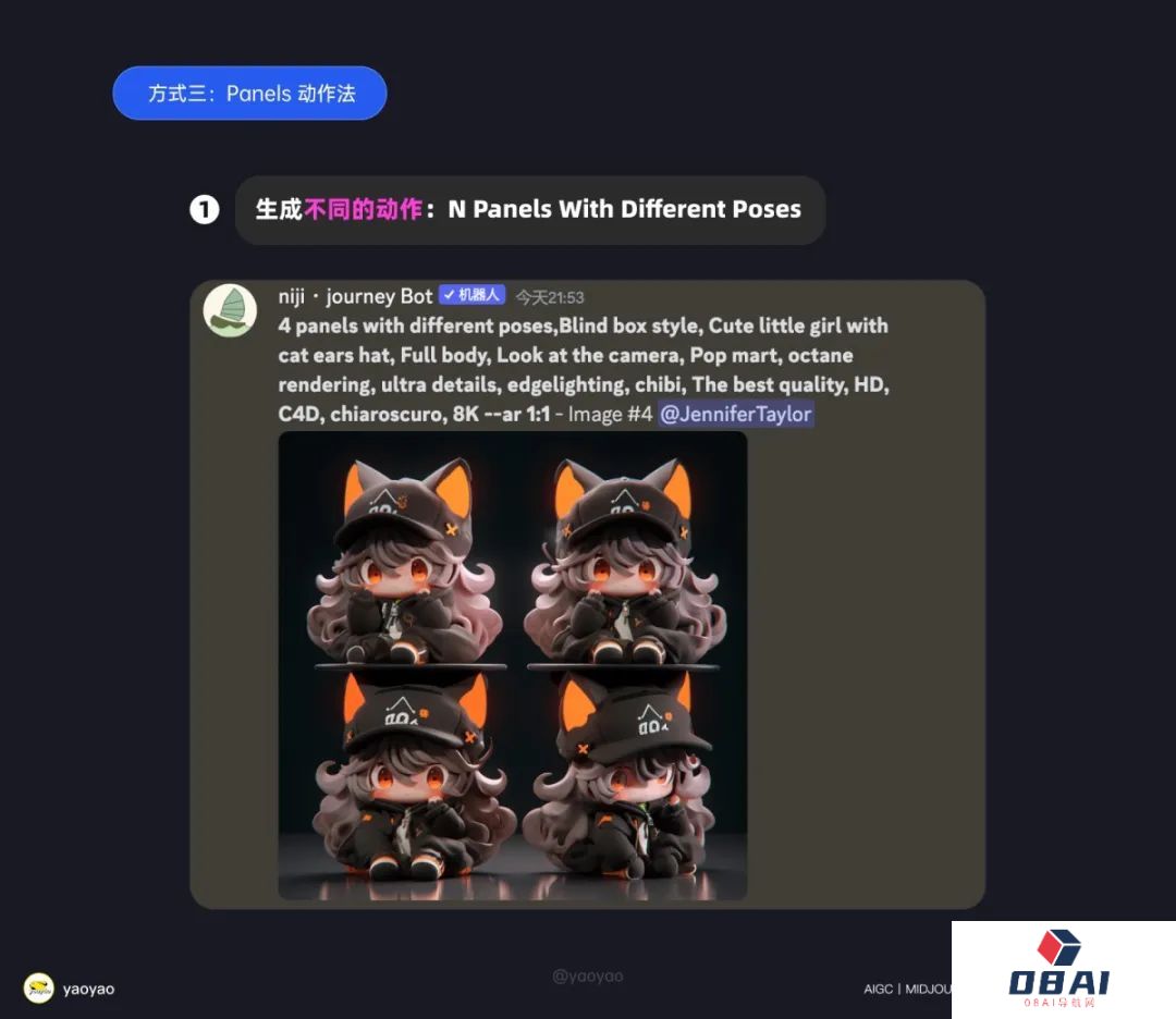 描述词:4 panels with continuous dancing,Blind box style, Cute little girl with cat ears hat, Full body, Look at the camera, Pop mart, octane rendering, ultra details, edgelighting, chibi, The best quality, HD, C4D, chiaroscuro, 8K