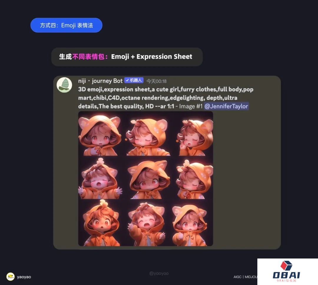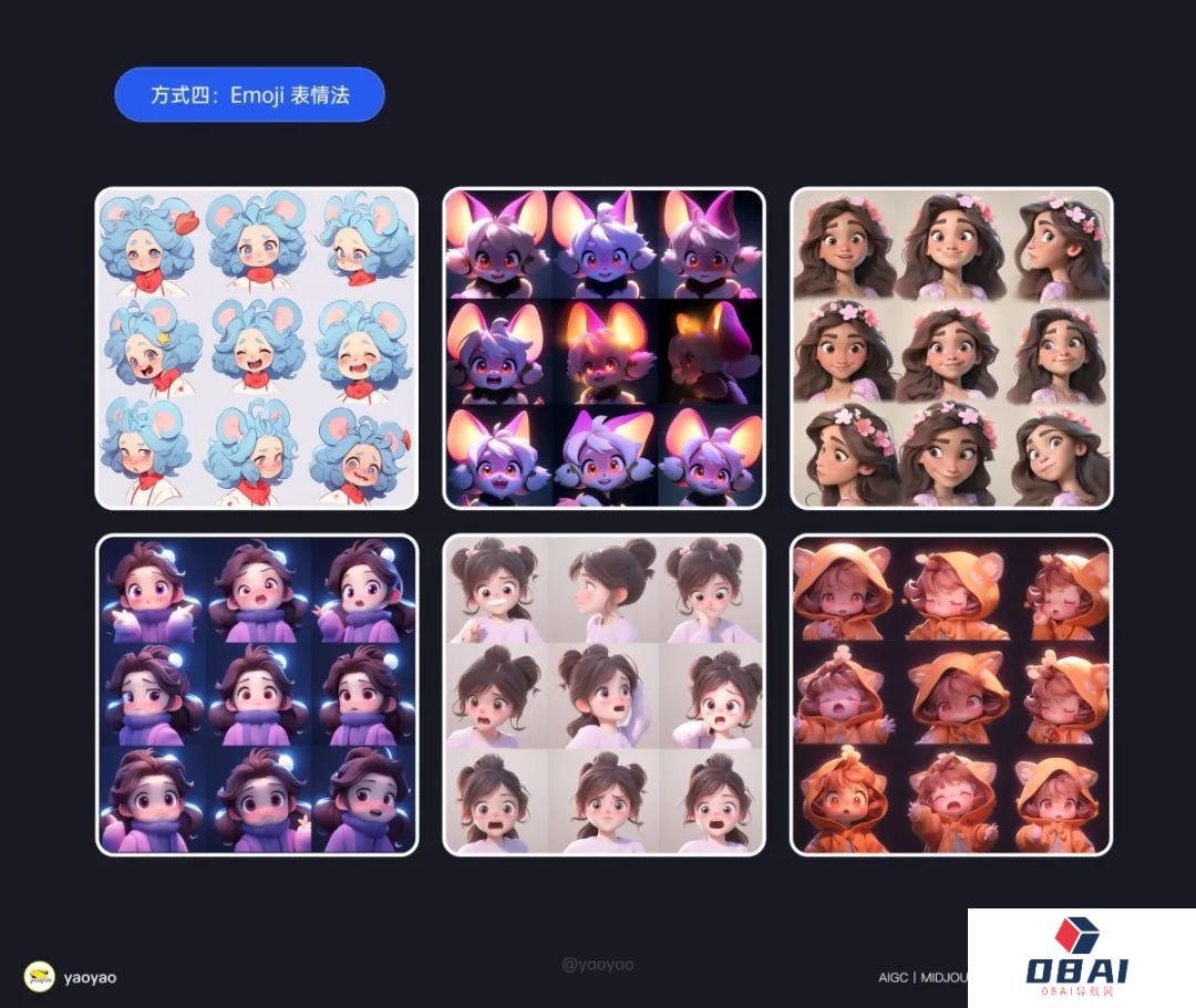 Emoji 代表着表情包,Express sheet 是各种表情的组合,通过 Midjourney 的 「emoji + expression sheet」,可以轻松制作角色一系列表情包。