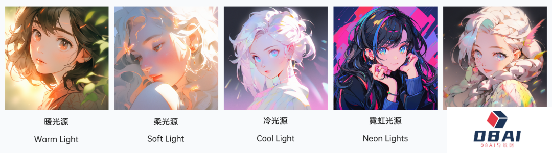 在我自己整理的「AIGC 关键词」库中选取几个有代表性的灯光参数,来观察一下对角色氛围感的影响。