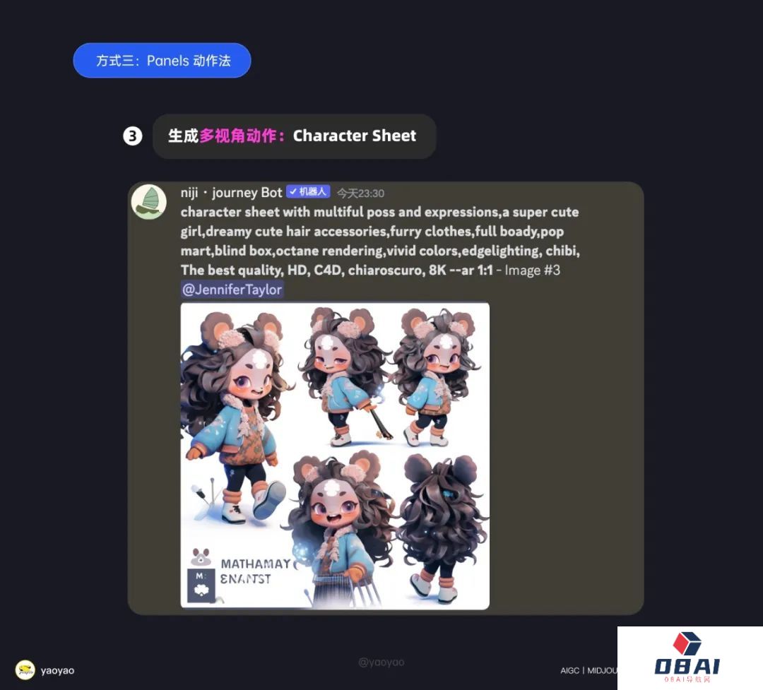 我们输入 「4 panels with different poses + 描述词 」得到不同动作的角色图