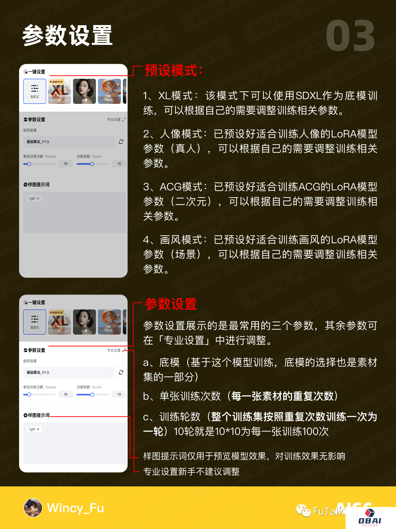 1、训练入口 进入首页,选择右上角“训练我的LoRA”,进入模型训练(记得领取一下免费会员,才可以在线训练);进入模型训练界面。分为左边「参数设置」,右边「图片/数据处理」两部分。