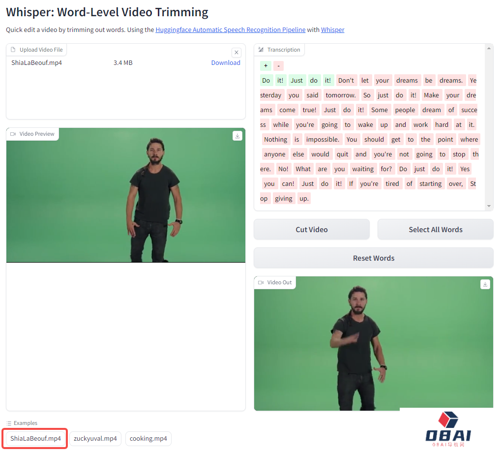 之后,直接点击右侧词汇区域,选择自己想要的词汇,点击“Cut Video”,很快,下方就会生成所需的视频片段了,可以观看以下演示视频: