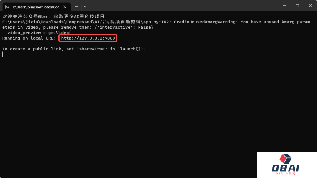 加载成功后,会看到地址“http://127.0.0.1:7860”,将地址复制到浏览器打开,就可以看到AI分词自动剪辑视频工具的主界面了。