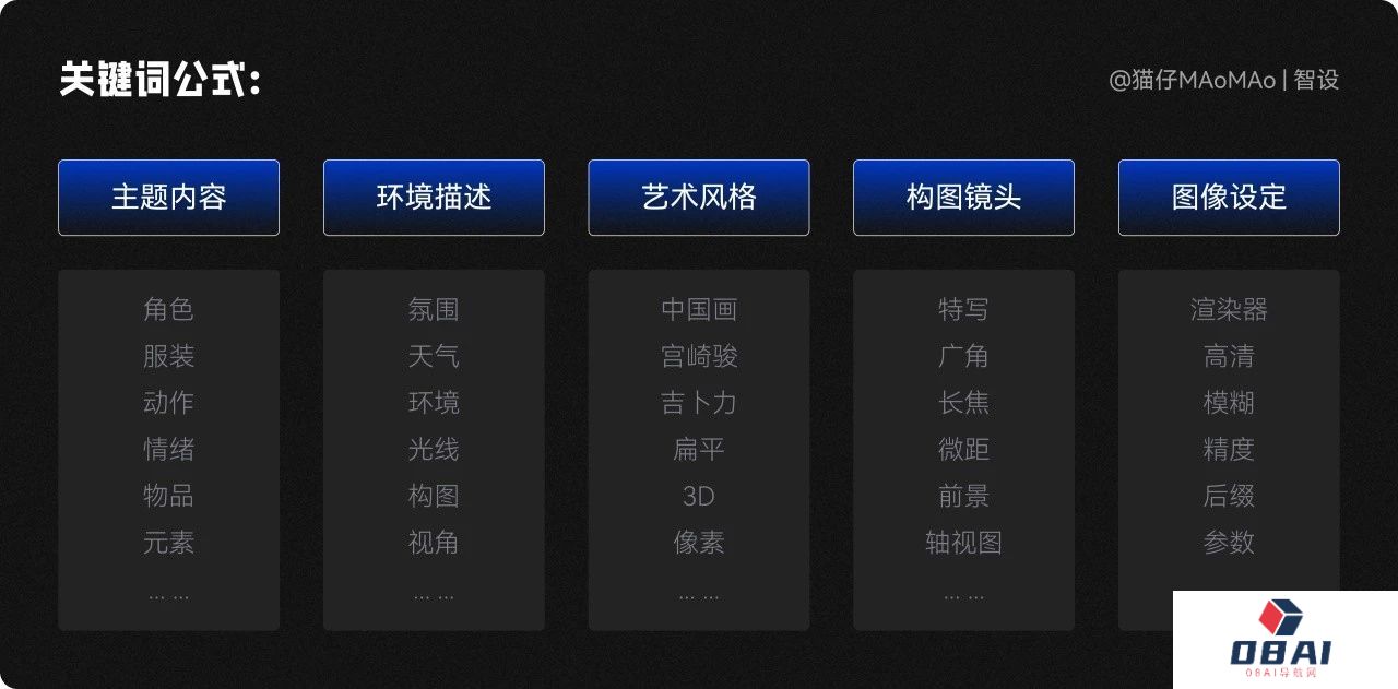 3D主视觉我们采用文生图的方式制作,写关键词的基本公式参考下图,具体写关键词时,需要灵活进行增减,然后不断尝试,直到出现自己满意的效果。