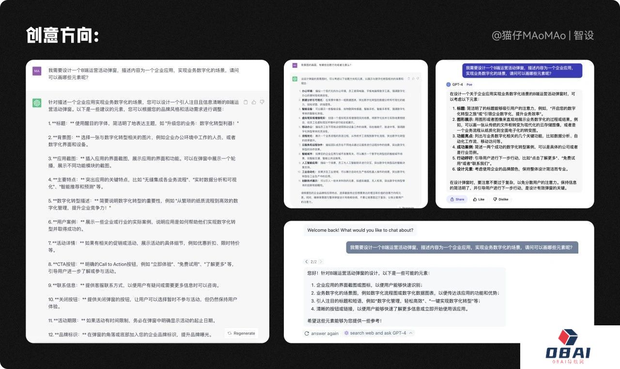 在没有设计方向的时候,不妨让AI大语言模型来帮助我们,它会根据需求的业务场景,给出合理的内容建议,以及画面元素的建议。