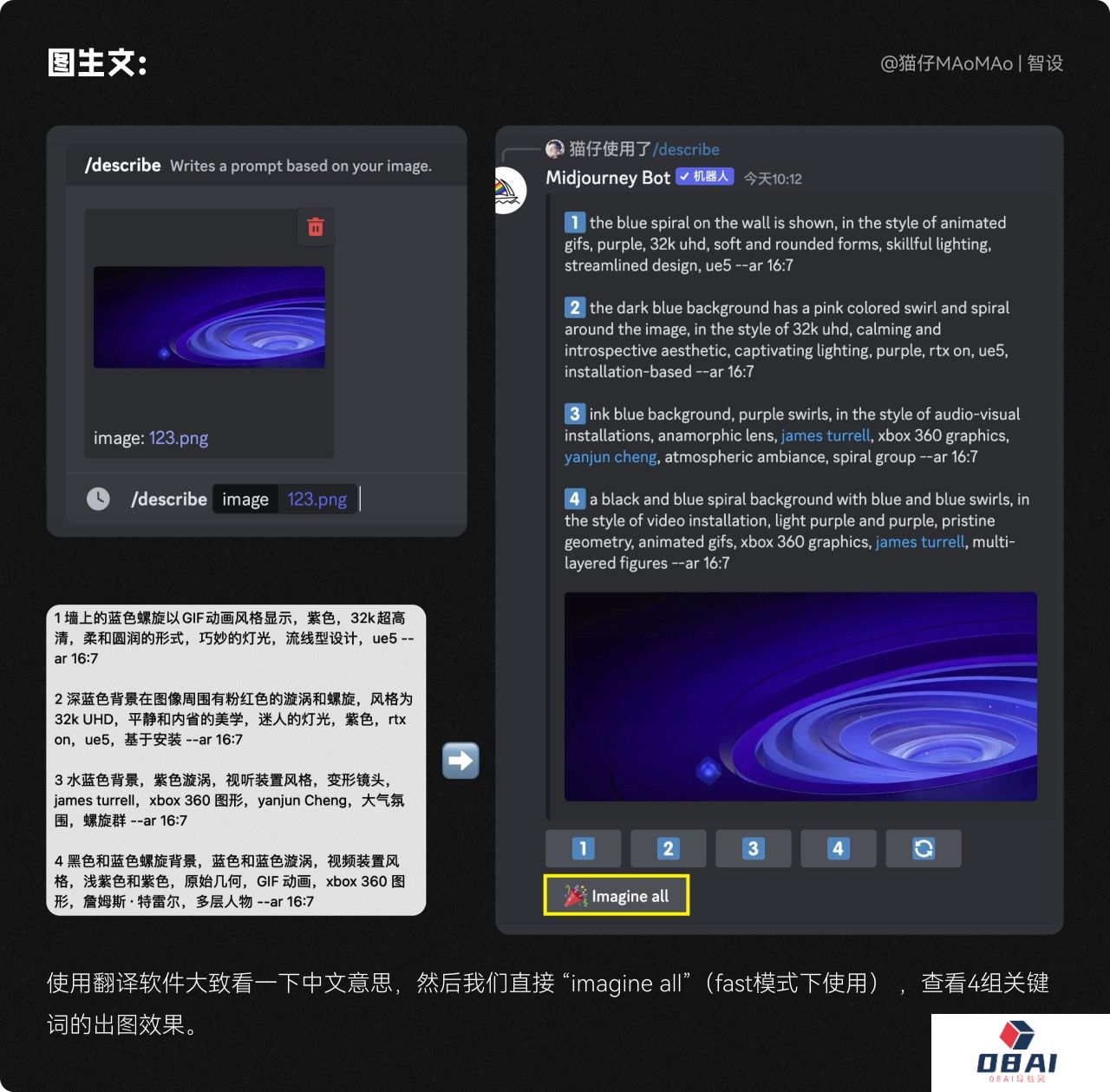我们得到最终的背景图,就可以在 Midjourney 里进行操作了,输入命令 /describe ,把图片拖入输入框中,回车等待系统结果。