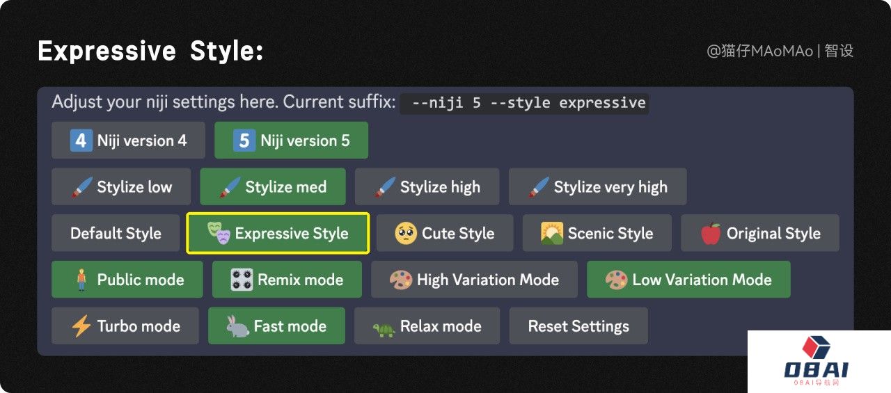 因为是单个元素生成,背景环境关键词可以省略,大家在编写关键词时,注意灵活增减,不用一定按照所谓的公式来写,艺术风格是插画素材,我们直接使用niji模型,其中expressive风格会让插画更加富有表现力,可以直接在关键词后面加上后缀“--style expressive ”,或者用“/settings”命令,更改设置。