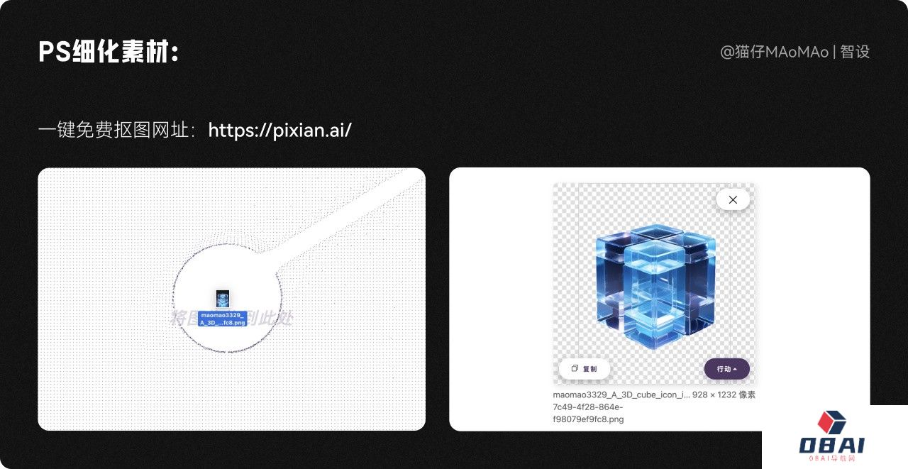 3D主视觉的部分,我们需要先进行抠图,如果不想使用 PS 手动抠图,这里推荐我常用的一键免费抠图网站:https://pixian.ai/,处理简单的图片,直接把图片扔进去就好了,简单好用~