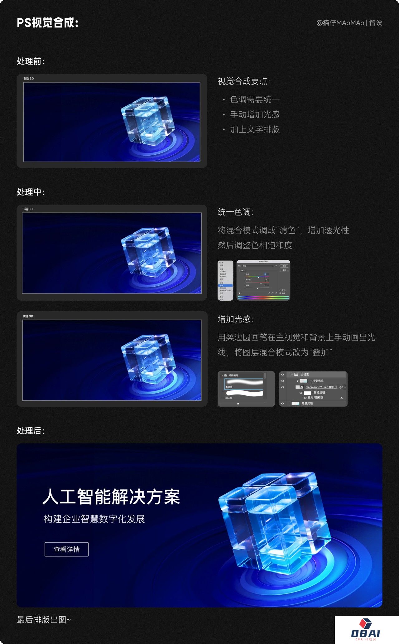 这里我定的主要色调是蓝色+青色的光感,首先需要将色调整体统一;然后想要表现出玻璃质感的通透,我们需要加上一些光感;最后文字排版出图即可~
