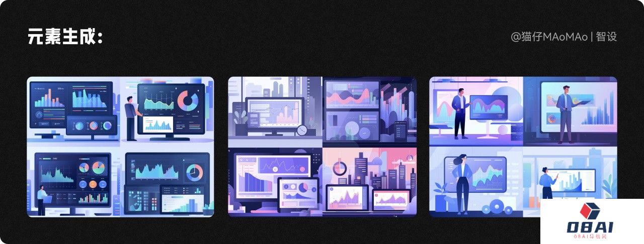 数据分析与可视化的背景,直接生成数据图表的效果并不是很理想,把办公室场景全部描绘出来生成的素材更加符合需求,但是还需要再手动对素材进行细化。