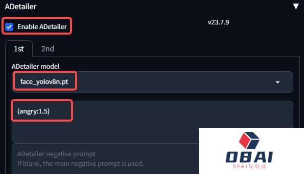 接下来就是重头戏了!我们需要打开ADetailer这个插件,选择一个适合的人脸检测模型,然后在提示词框里给出表情的描述,比如“生气”、“微笑”等,同时设定一个权重增强该提示词的作用。