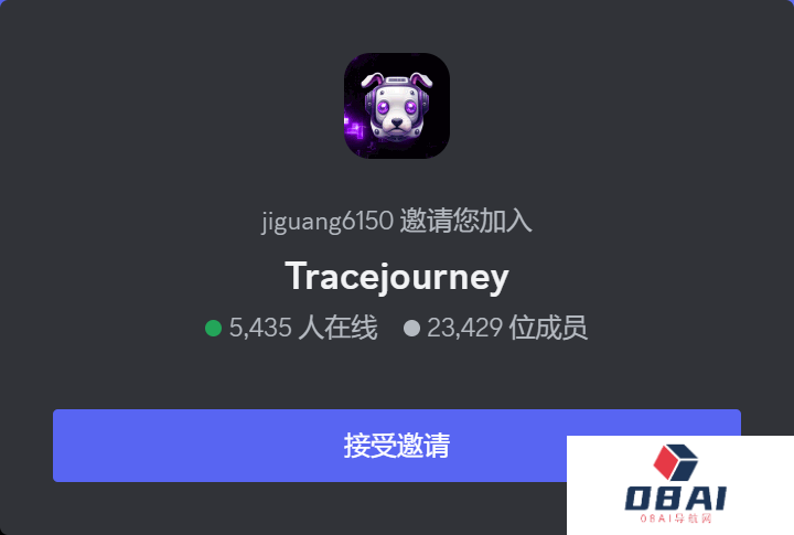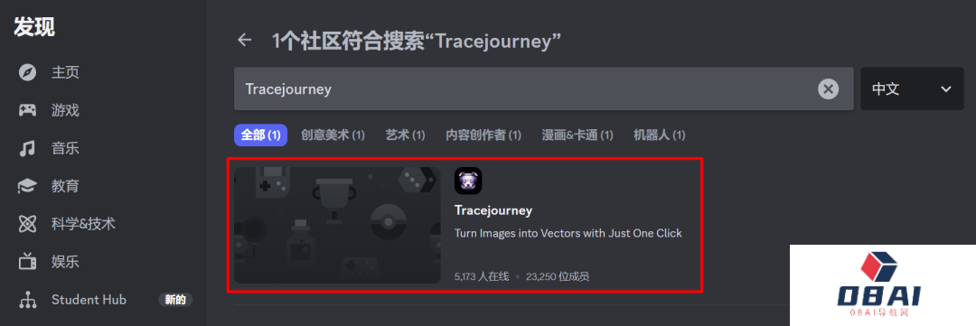 第二种就是直接在发现主页通过搜索关键字添加,如下图所示,点击即可进入Tracejourney服务器。目前还不能将Tracejourney Bot机器人加入到你自己的服务器,所以只能去公用的频道里面去使用。当然在公用频道里面生成的图频道内所有成员都可以看到。如果你不想让所有频道成员看到你生成的图,也可以在自己的服务器里面生成图片后再导入Tracejourney服务器,后面会讲到具体的导入方法。(在Tracejourney服务器里面生成图片的方法跟在自己的服务器里面生成图片的方法一样,就不再赘述。)