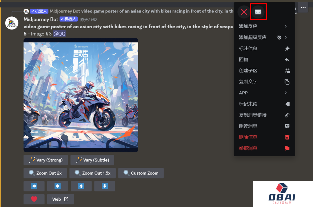 (1)在自己的服务器生成图片后,点击右上角的信封图标,系统会发送这张图片的生成信息,Job ID和seed值。