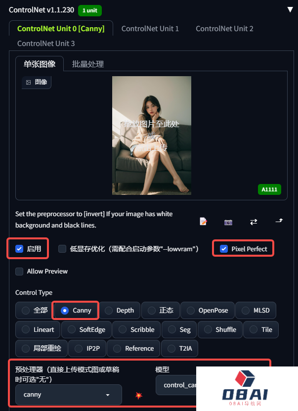 还需要做一个操作,即启用ControlNet插件里的canny,以保证生成的图片姿势外观基本不变。配置按下方的图示即可。