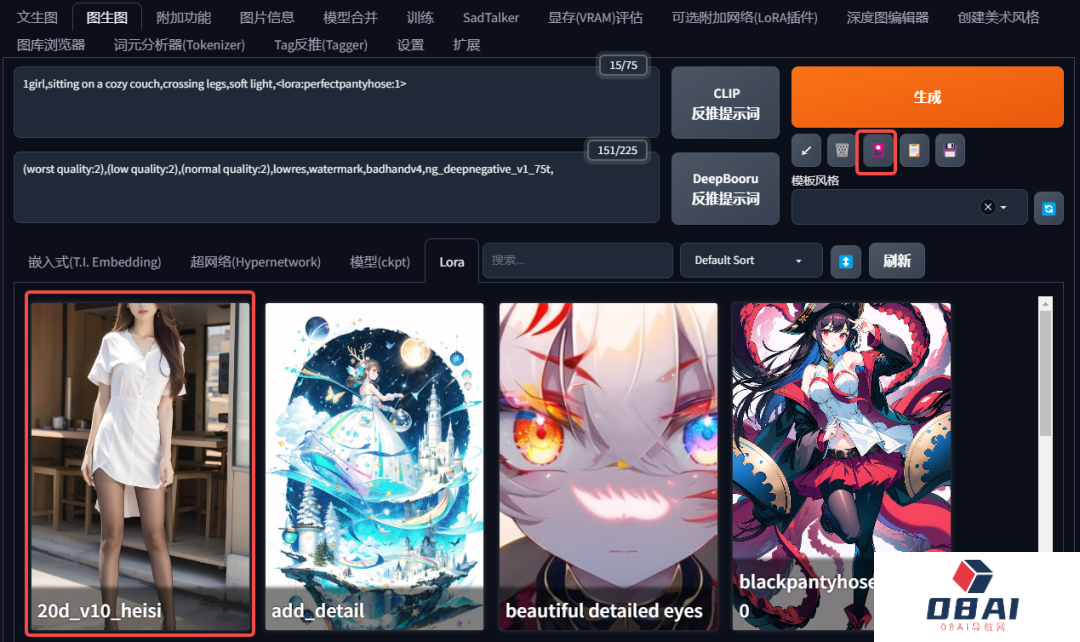 下载20D黑丝模型,并放置在stable diffuison webuimodelsLora目录中。点击生成按钮下方的紫色按钮,选择Lora选项卡,点击20D黑丝即可启用此Lora模型。