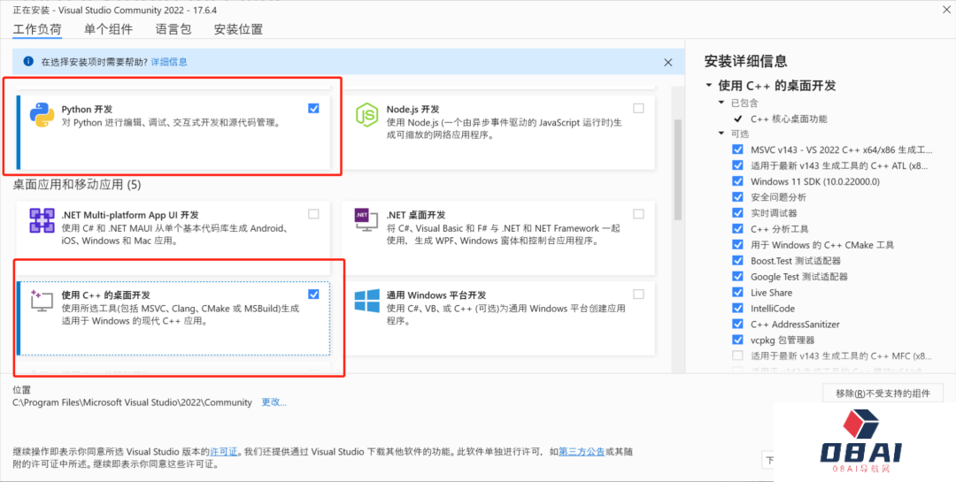 安装时,记得选中Python开发和C++开发。