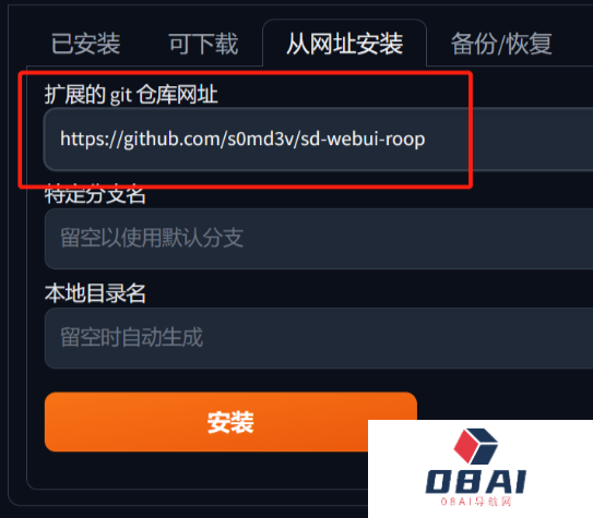 第三步,在Webui界面点击“扩展”,然后在"从网址安装"中填入以下链接,并等待安装完成(需要全局魔法):https://github.com/s0md3v/sd-webui-roop