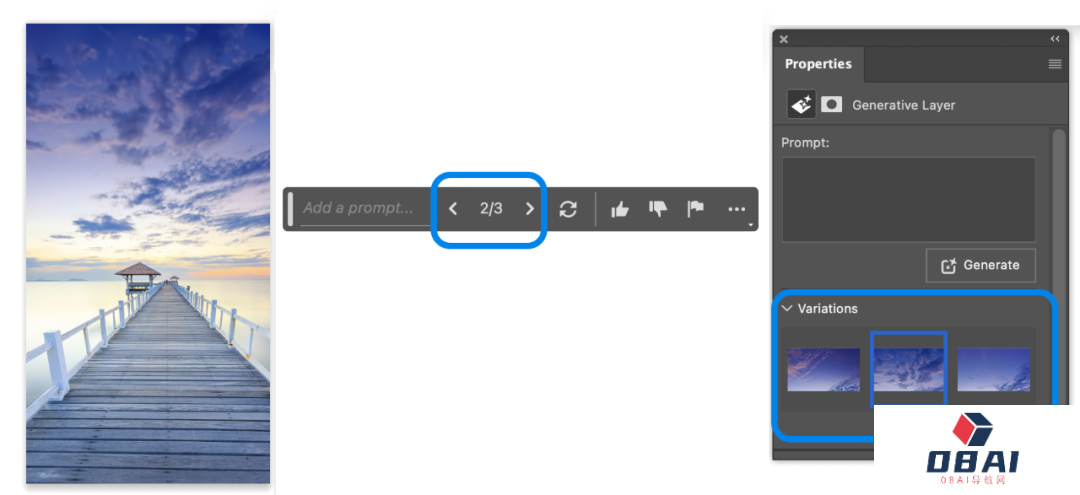 等待PS AI生成扩图缺失的部分,然后根据AI生成的三张结果当中选择你最喜欢的那张并保存。如果三张都不满意,就再次生成。