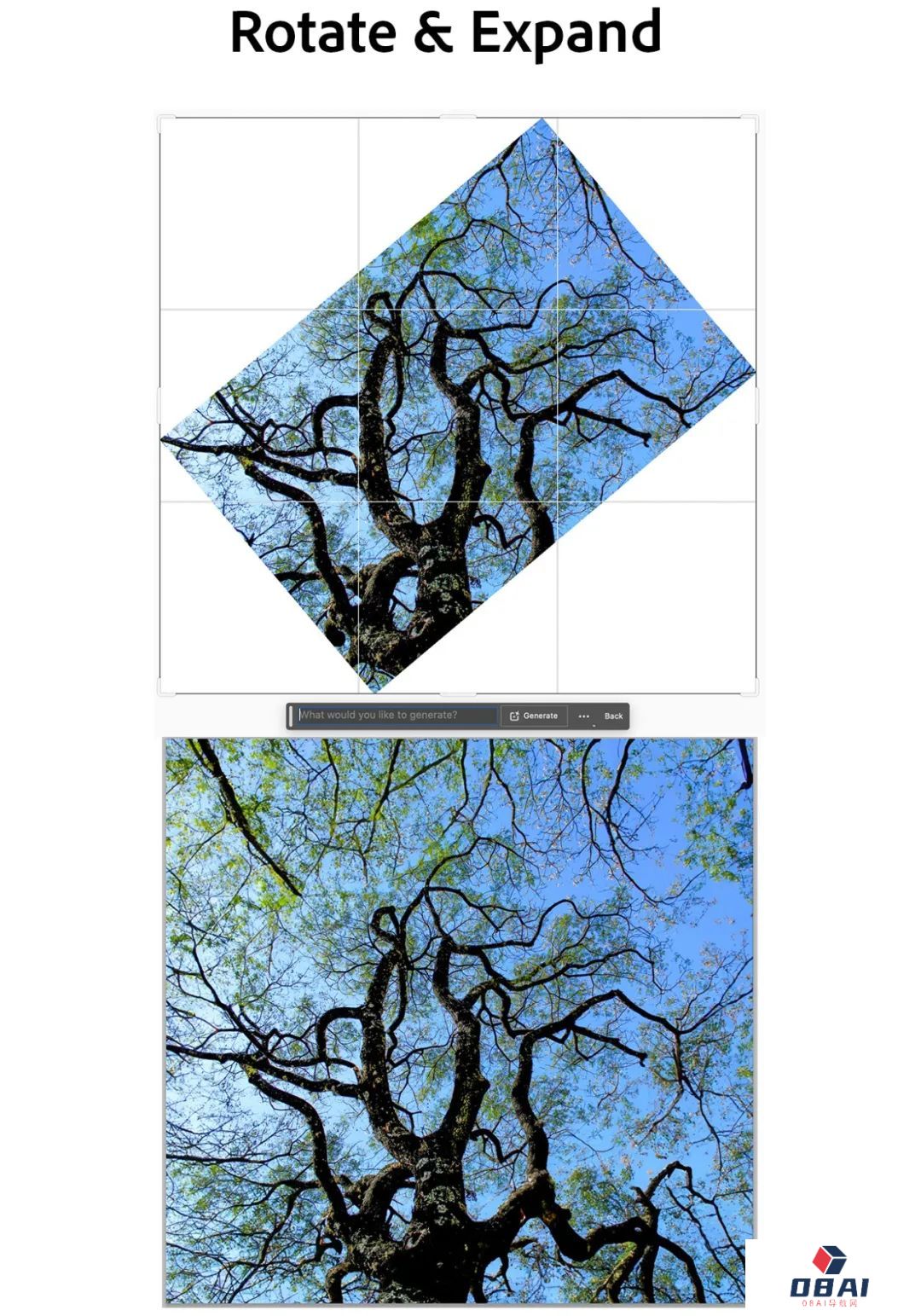 先进行照片的旋转,将树干作为画面的主体,将角度转正,再利用Expand功能一键扩图,便得到了一幅非常有质感的仰角图。