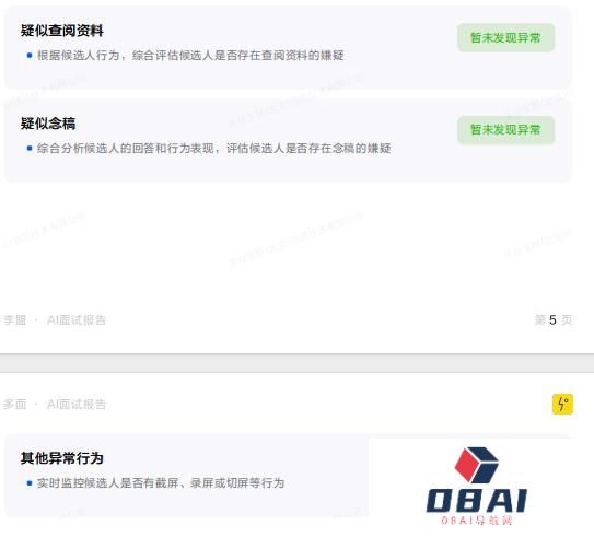 ▲报告对面试异常行为进行监控在面试过程中,面试者离开摄像头范围或者眼神飘向其他方向,会被系统提醒。如果回答内容比较模糊或者相关度不高、面试中进行截屏等操作同样会被提醒。记者在报告最后部分看到,系统会对面试者是否存在查阅资料、念稿、截屏等异常行为进行监控。**AI面试作弊工具同步出现企业称可防范近几年,市面上出现了多家AI面试产品,各家招聘平台几乎都推出了自己的AI面试工具,如猎聘旗下的Doris、智联招聘旗下的AI易面、牛客网旗下的牛客AI面试、蓝灰领岗位招聘的海纳AI面试等,还有多家企业提供模拟AI面试服务。记者从BOSS直聘方面获悉,其相关AI面试产品也会在近期上线。《牛客2024秋季校园招聘白皮书》提到,2024年秋季招聘中AI招聘应用率从2023年的23.2%激增至71.5%,显示ai应用已从试验阶段过渡到实际部署阶段,且效果逐年增强。其中还提到,2024年AI面试普及到全行业各类岗位,包括校招、社招及白领、蓝领职位,尤以互联网、智能制造、快消/商超领域为先锋。猎聘相关负责人告诉红星新闻记者,AI面试并不是很新鲜的产品。他们的AI面试产品Doris是在去年年底上线发布,但基于小模型的AI面试服务早在2019年就已上线,当时就有一些国企和银行在校招中使用。该负责人提到,未来AI面试可能会扩展到所有企业人才招聘的首轮面试,所有招聘者都可用AI对求职者的语言沟通、逻辑表达等能力进行初步筛选,提高招聘效率。除此之外,这个AI大模型未来还可用于企业的人才盘点、人才潜力测评等。